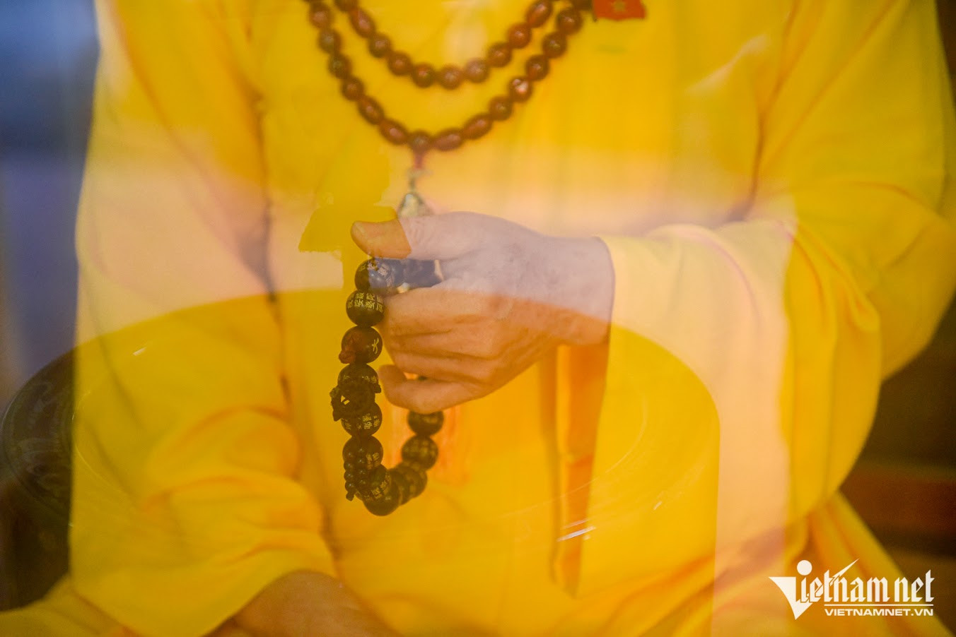 Bàn tay trái đang lần tràng hạt của hòa thượng được khắc họa với những nét gân xanh như thật. Ngón chân, ngón tay đều có đường nét rất chân thật