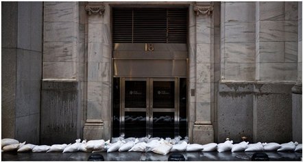 Trong một bức ảnh được đăng trên trang mạng xã hội Twitter, lối vào của sở giao dịch chứng khoán New York được lót bằng bao tải cát. Sở giao dịch này phải đóng cửa vì lý do thời tiết lần đầu tiên trong vòng ba thập kỉ qua.