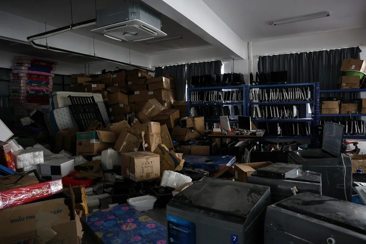 Quân đội Thái Lan đã tiến hành ném bom và giành quyền kiểm soát khu vực này trong các cuộc đụng độ biên giới với Campuchia năm ngoái. Bên trong tòa nhà là những vết đạn xuyên thủng, trần nhà sập và mảnh kính vỡ. Các ông trùm và nhân viên dường như đã tháo chạy khi giao tranh leo thang, bỏ lại thức ăn, hàng đống tài liệu, công cụ lừa đảo và những xấp tiền giống hệt tờ 100 USD.