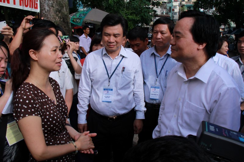 Bộ trưởng Giáo dục hỏi chuyện người nhà thí sinh Đến thị sát điểm thi THPT quốc gia tại Trường ĐH Thủy lợi sáng nay, Bộ trưởng Bộ GD-ĐT Phùng Xuân Nhạ tranh thủ hỏi thăm người nhà thí sinh.