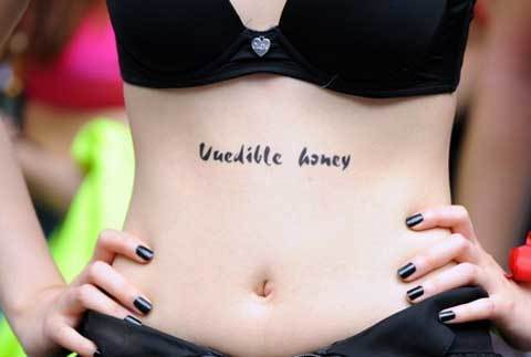 hiệu được viết trên một chiếc băng màu vàng quấn trên cơ thể một phụ nữ cho