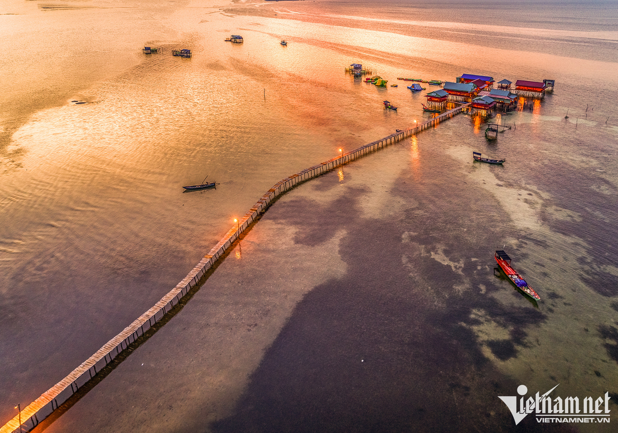 Làng chài Rạch Vẹm nằm ở phía đông đảo Phú Quốc được biết đến với một tên gọi khác là “Vương quốc sao biển”. Lý do là từ tháng 1 đến tháng 5, sao biển thường xuất hiện nhiều tại bờ biển, tạo nên hình ảnh lạ lẫm, đẹp mắt. Khi đến thăm Rạch Vẹm, du khách được trải nghiệm ngồi ăn trên những nhà hàng bè nổi độc đáo, mỗi nhà hàng đều xây dựng những cây cầu riêng để du khách di chuyển. Đây cũng là một trong những điểm check-in nổi bật của đảo ngọc. Ảnh: Quang Ngọc - CTV.