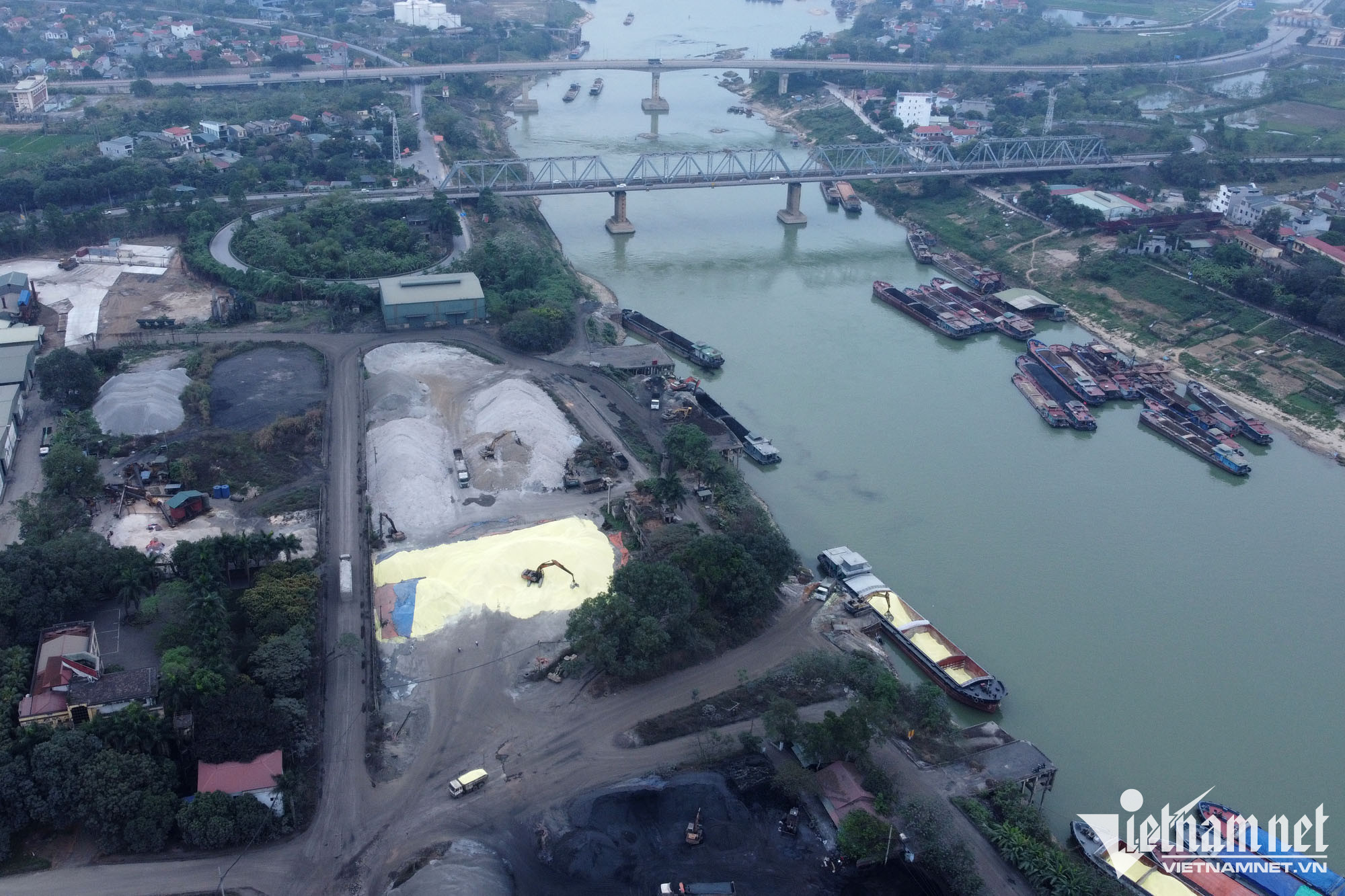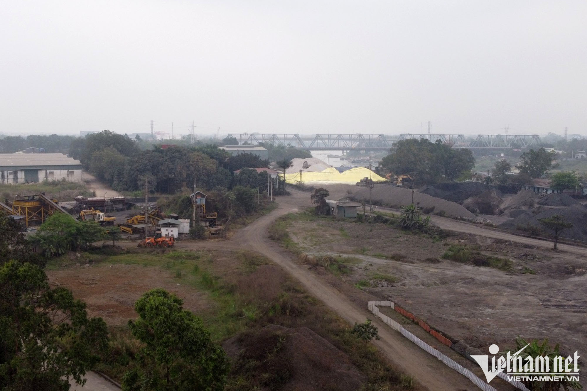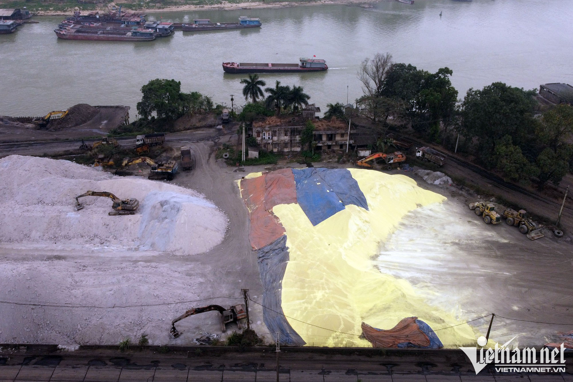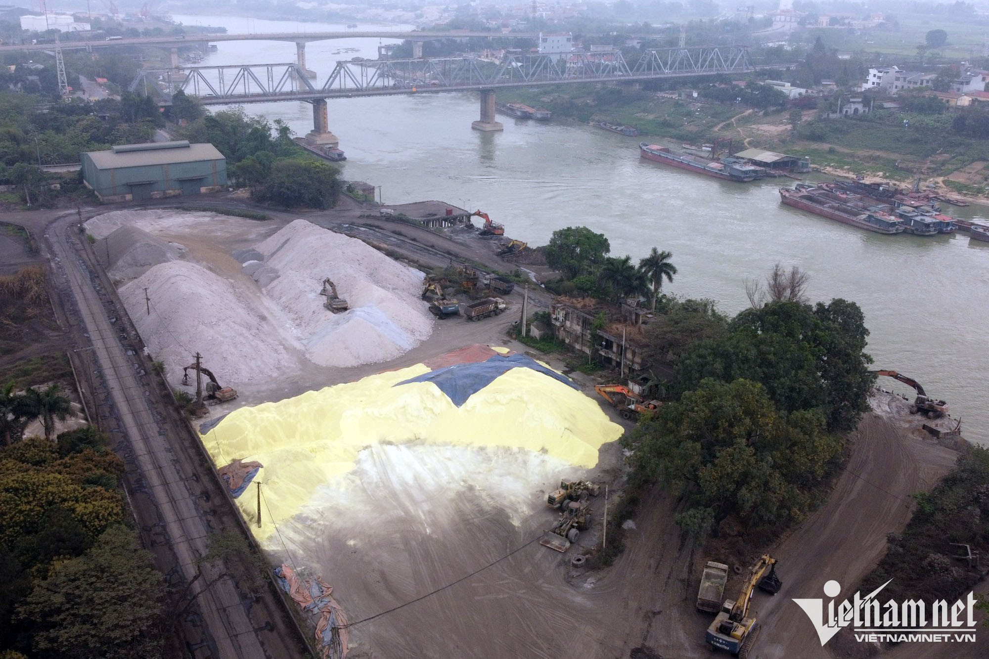 Bãi lưu huỳnh khổng lồ chỉ được che đậy sơ sài một góc. Hình ảnh ngày 25/3. Ảnh: Đoàn BổngBãi tập kết lưu huỳnh nằm cách sông Hồng chỉ khoảng 30-40m. Ảnh: Đoàn BổngTừ đường Nguyệt Cư, bãi lưu huỳnh lớn tập kết lộ thiên. Ảnh: Đoàn BổngVị trí bãi tập kết gần cầu Việt Trì. Ảnh: Đoàn BổngQuan sát từ đường Nguyệt Cư không khó để nhìn thấy quá trình san gạt trong bãi thải khiến bụi lưu huỳnh phát tán ra môi trường. Ảnh: Đoàn BổngLưu huỳnh vương vãi dọc bên sông trong quá trình vận chuyển. Ảnh: Đoàn Bổng Chính quyền Phú Thọ bất ngờ về bãi lưu huỳnh