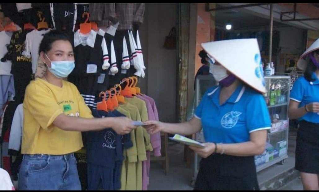 Hội viên Hội Liên hiệp phụ nữ huyện Thanh Thủy đi phát tờ rơi tuyên truyền về giảm thiểu tác hại nhựa.