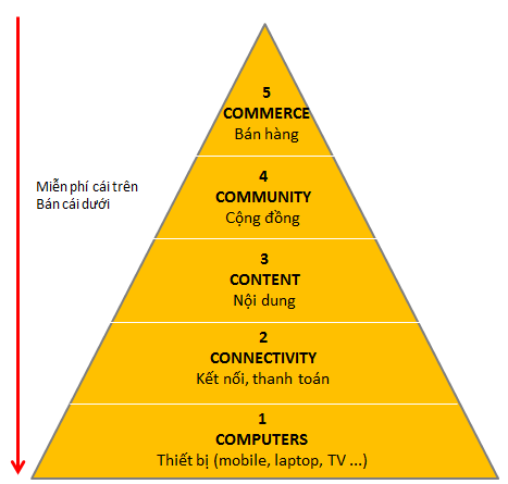 Ở hình tháp trên, sự phát triển của các dịch vụ nội dung số đều phải trải qua các giai đoạn từ dưới lên trên. Doanh thu ở các tầng dưới lớn, càng lên cao càng nhỏ. Mô hình này lý giải tại sao các dịch vụ nội dung của nhà mạng thu tiền tỉ, trong khi các đơn vị khác loay hoay cả chục năm ròng mà doanh số vẫn tí hon. Hầu hết các công ty dotcom Việt Nam đều đang hoạt động ở các tầng 3-4-5, trong khi đó để bán được nội dung (tầng 3) tiền tỉ, nhà mạng đã làm rất tốt 2 tầng phía dưới.