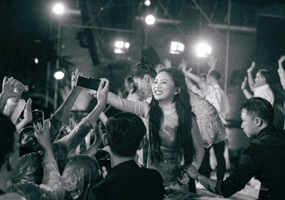 Chứng kiến cảnh khán giả, khách mời… đội mưa chờ xem chương trình khiến Phương Mỹ Chi xúc động. Cô bật khóc, phát loa nói lời cảm ơn đến mọi người.