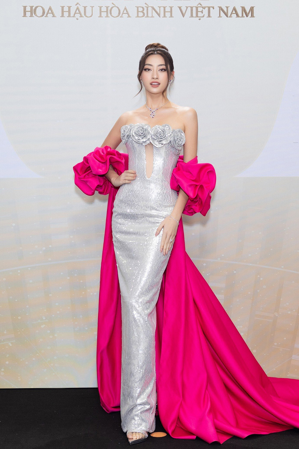 Hoa hậu Việt Nam 2022 Thanh Thuỷ rạng rỡ đeo vương miện, diện đầm cúp ngực đuôi cá với phần tà in hoa. Á hậu Trịnh Thuỳ Linh cũng lựa chọn đầm đuôi cá ôm sát tông trắng trễ vai, phối cùng dây chuyền bạc và bông tai bản dài. Đại diện Việt Nam tại Hoa hậu Liên lục địa 2023 - á hậu Ngọc Hằng sắc sảo với đầm 2 dây màu bạc chủ đạo đính đá lấp lánh, được cut-out ở eo.