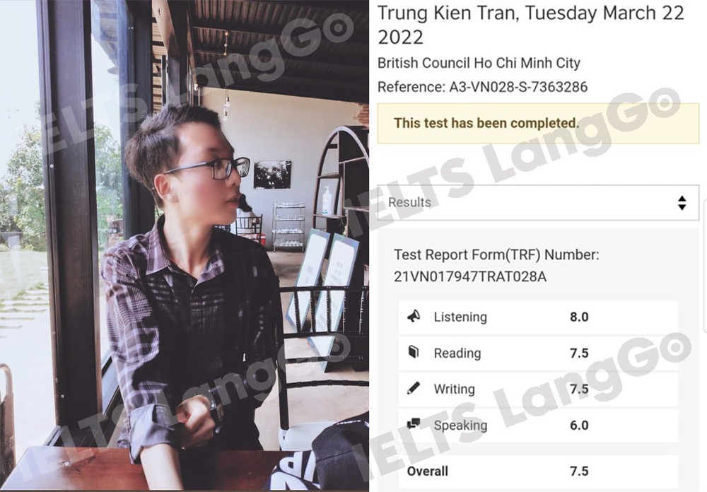 Trung Kiên - Overall 7.5 IELTS chia sẻ: “Sau khi nhận kết quả mình rất bất ngờ, điểm số này vượt ngoài kỳ vọng. Đặc biệt nhất là kỹ năng Viết (Writing) của mình thi được 7.5. Hồi mới vào học, mình kiểm tra Writing chỉ có 4.5 thôi. Nhưng nhờ có thầy cô tại LangGo chỉ dẫn tận tình những cách để xây dựng dàn ý, trình bày ý tưởng, mình mới có thể tự tin hơn khi viết. Ngoài ra, một điều mình thực sự rất thích tại IELTS LangGo chính là trong quá trình ôn luyện, bọn mình sẽ được cho một đề và chia nhóm rồi cùng thảo luận ý kiến. Làm việc nhóm như vậy đã giúp mình có thể học hỏi được từ những bạn khác và từ đó trau dồi bản thân hơn”.