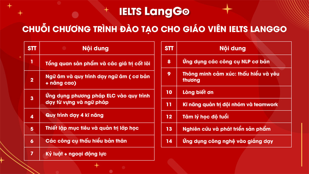 Tại LangGo, 100% giảng viên đều phải đạt tối thiểu 8.0 IELTS và cần có kinh nghiệm giảng dạy, luyện thi lâu năm. Cùng với đó, các giảng viên đều phải trải qua quá trình đào tạo, dạy thử và đánh giá liên tục để đảm bảo chất lượng. Mỗi tháng, tất cả các thầy cô tại LangGo sẽ được tham gia vào các chương trình training từ kiến thức chuyên môn như: Ứng dụng phương pháp ELC vào quy trình dạy từ vựng và ngữ pháp; Ngữ âm và quy trình dạy ngữ âm… cho đến các khóa học về tư duy và tâm lý học có thể kể đến: Kỷ luật và Ngoại động lực; Tâm lý học độ tuổi; Các công cụ thấu hiểu bản thân;…. Đây được đánh giá là điểm sáng độc đáo trong quá trình đào tạo giảng viên tại LangGo.