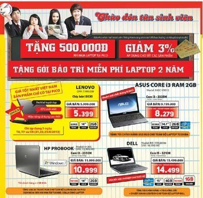 Pico đang dành tặng 150.000 tân sinh viên các trường ĐH khu vực Hà Nội 150.000 thẻ thành viên với các ưu đãi: Tặng 500.000đ khi mua laptop tại hệ thống siêu thị điện máy Pico (tương đương gói hỗ trợ lên đến 75 tỷ đồng cho Sinh viên khi mua laptop) và chiết khấu 3% cho các lần mua hàng tiếp theo, tặng gói bảo trì miễn phí trong vòng 2 năm đối với các sản phẩm laptop. Mỗi thẻ thành viên cũng chính là vé mời cho tất cả các chương trình dành cho SV do báo SVVN, Hội SVVN và Pico tổ chức sau này. |