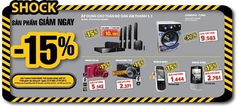 - Giảm 5% khi khách hàng thanh toán bằng thẻ ngân hàng Quân Đội (MB). Chương trình diễn ra từ ngày 21/9 đến 31/10/2012.