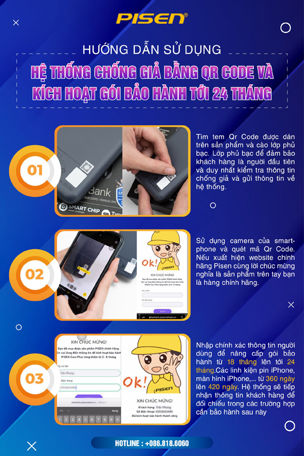 Cụ thể, sau khi tiến hành quét mã QR Code chống giả, khách hàng sẽ được hỗ trợ kích hoạt gói bảo hành gia tăng lên tới 24 tháng với phụ kiện và 420 ngày với pin và màn hình điện thoại. Thao tác đơn giản ngay trên smartphone của mình. Do đó, người tiêu dùng có thể yên tâm khi lựa chọn mua hàng Pisen chính hãng có chứa mã QR Code.