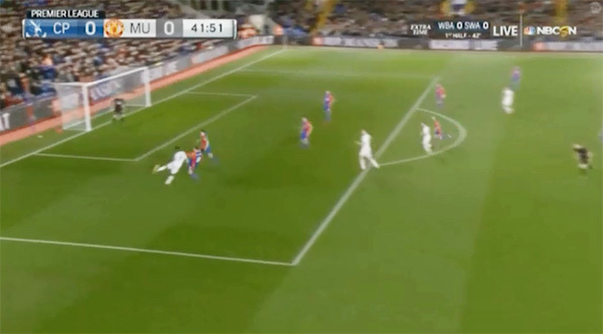 Pogba tung ra đường chuyền cực kỳ tinh tế cho Rooney lẻn vào vòng cấm dứt điểm nhanh. May cho Palace là thủ thành Hennessey đã xuất sắc cứu thua.