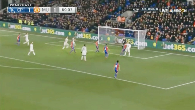 Ở tình huống phạt góc ngay sau đó, một cầu thủ Palace chơi bóng bằng tay khá rõ trong vòng cấm nhưng trọng tài không cho MU hưởng quả phạt đền.