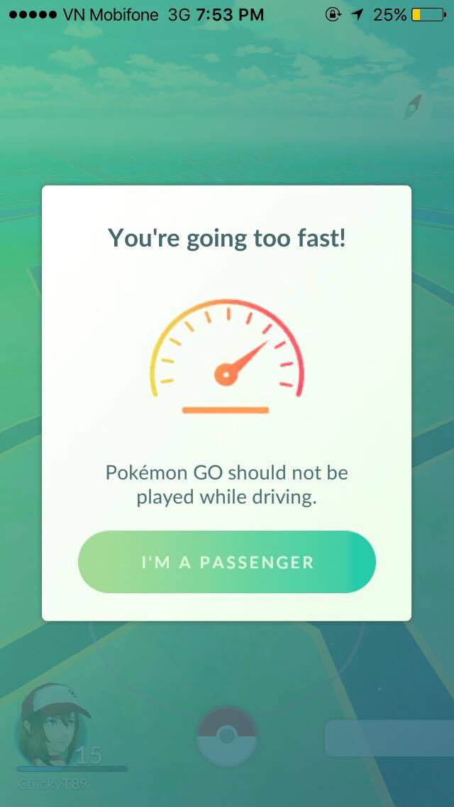 Khi bạn di chuyển với tốc độ quá nhanh, một cảnh báo khác hiện lên: "You’re going too fast! Pokemon Go should not be played while driving" ("Bạn đang đi quá nhanh! Bạn không nên chơi Pokemon Go khi đang lái xe").