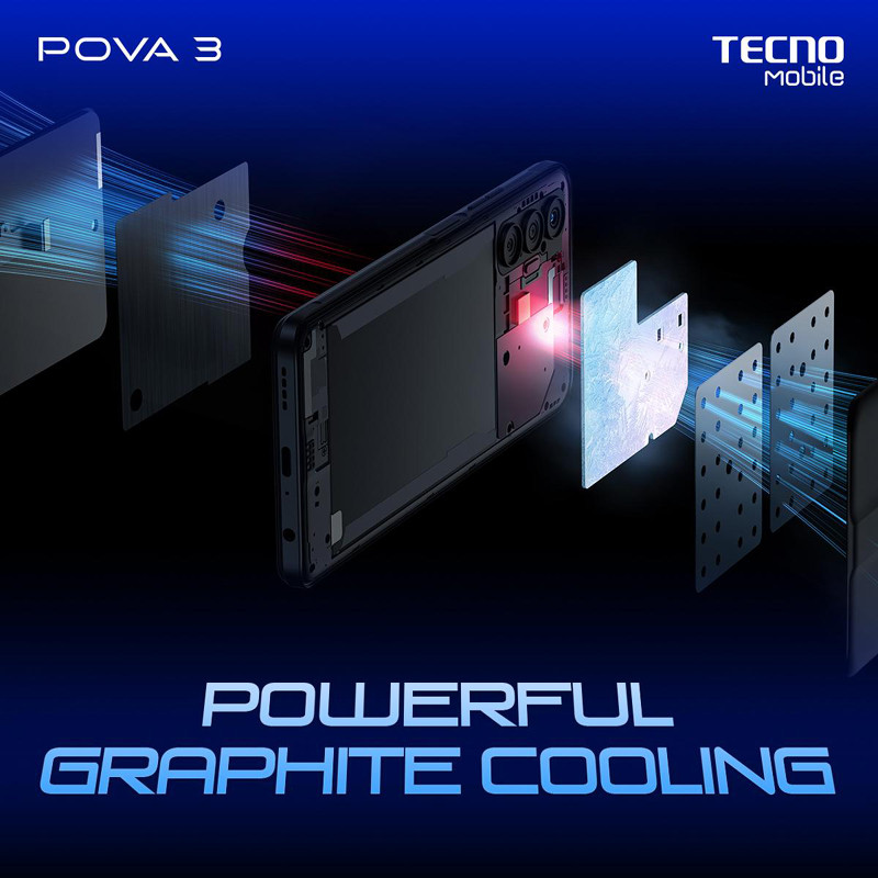 Phát triển cơ chế tản nhiệt bằng than chì nhiều lớp cho vỏ pin, bo mạch chủ và vỏ mặt, vùng phủ rộng lên đến 9587mm2, Pova 3 giúp các game thủ giảm sức nóng trong những trận game gay go, duy trì độ ấm chỉ từ 40 độ C. So với thế hệ trước, diện tích tản nhiệt của nắp pin tăng 35%, được đánh giá là một trong những đặc điểm nổi bật của dòng sản phẩm mới này.