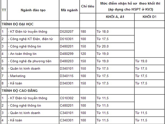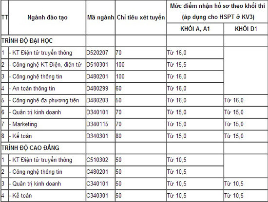 Tại cơ sở đào tạo TP.HCM, điểm nhận hồ sơ xét tuyển nguyện vọng bổ sung vào hệ Đại học 4 ngành Kỹ thuật điện tử - truyền thông, CNTT, An toàn thông tin và Công nghệ đa phương tiện từ 16 điểm trở lên. Mức điểm từ 15 trở lên là điểm nhận hồ sơ xét tuyển bổ sung vào hệ Đại học 3 ngành Quản trị kinh doanh, Marketing và Kế toán.