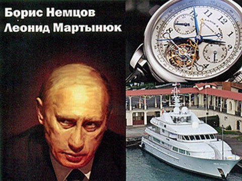 Một trong những tác giả của báo cáo này Boris Nemtsov, cựu phó thủ tướng Nga những năm 1990. Báo cáo có tên "Cuộc sống của một nô lệ" này cũng đưa ra một loạt hình ảnh về những chiếc máy bay, du thuyền, lâu đài được cho là thuộc quyền sử dụng của ông Putin. Ngoài ra còn có những tấm ảnh Tổng thống Nga trong những lần xuất hiện trước công chúng với rất nhiều loại đồng hồ đắt tiền, chỉ 11 chiếc trong số đó cũng đã trị giá 687.000 USD, gấp 6 lần mức lương hàng năm của Tổng thống Putin.