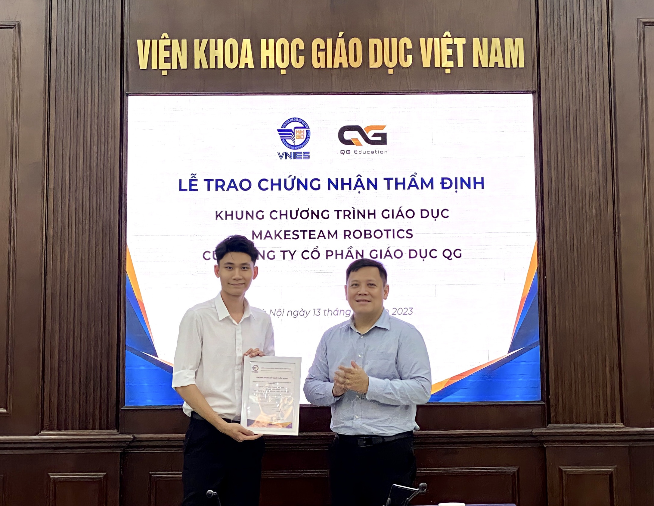 Tại buổi lễ, GS.TS Lê Anh Vinh - Viện trưởng VNIES đã công bố kết quả thẩm định và trao giấy chứng nhận kết quả thẩm định "Khung chương trình giáo dục MakeSTEAM Robotics" do Công ty Cổ phần Giáo dục QG (QG Education) xây dựng. Chương trình đạt tiêu chuẩn chất lượng theo hệ tiêu chí đánh giá chương trình giáo dục STEM của Trung tâm Phát triển bền vững Giáo dục Phổ thông Quốc gia - Viện Khoa học Giáo dục Việt Nam, phù hợp với Chương trình Giáo dục phổ thông 2018 để triển khai tại các trường phổ thông.