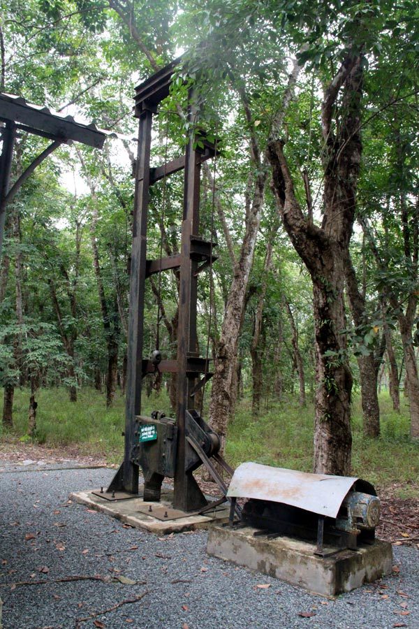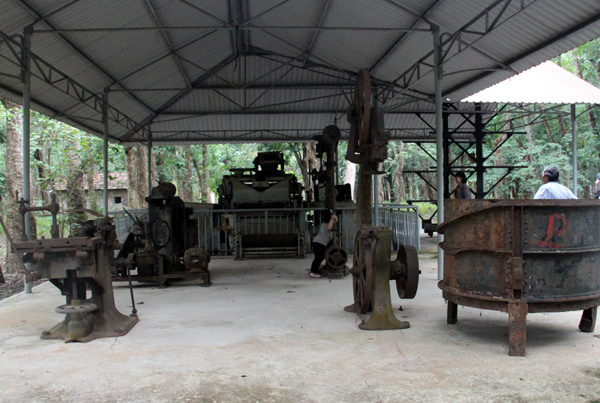 Bước vào khu di tích, hình ảnh người phu cạo mủ và người thu gom mủ đập vào mắt du khách. Quần áo xộc xệch, người đầu trần, người nón lá, họ làm việc một cách miệt mài.