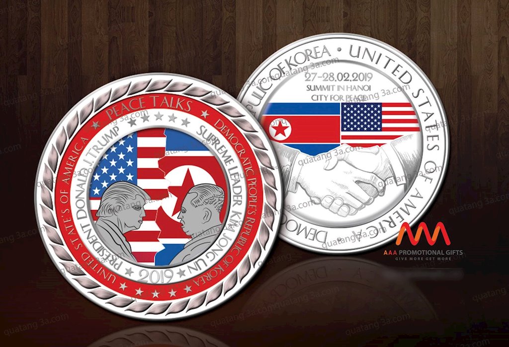 Đồng xu kim loại này có đường kính 40mm, mặt trước in hình ảnh hai vị lãnh đạo, mặt sau là hình ảnh bắt tay hứa hẹn cuộc đàm phán sẽ thành công tốt đẹp, mở ra một trang mới cho lịch sử thế giới hiện đại.
