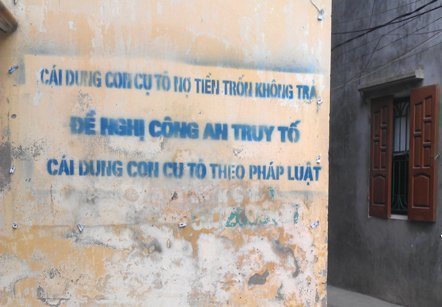 Vào rạng sáng ngày 25/11 người dân Phủ Lý lại được phen ngỡ ngàng tiếp khi được chứng kiến các dòng chữ có nội dung “tố” được in phun bằng khuôn sẵn, xuất hiện khắp nơi quanh căn nhà bị đòi nợ phạm vi 10 – 20 mét.