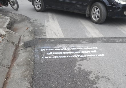 | Để tăng hiệu quả của chiêu mới, chủ nợ cho in ấn cẩn thận xuống cả mặt đường nhựa |
