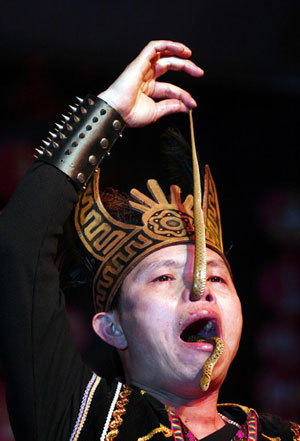 Tối 23/1, người dân Hà Nội đã được chứng kiến hàng loạt những tiết mục rợn người do những quái nhân Trung Quốc biểu diễn như dùng khoan điện ngoáy lỗ mũi, móc sắt vào mí mắt kéo ôtô, dùng lưỡi giữ cánh quạt sắt đang quay tít, cho rắn chui qua mũi xuống miệng...