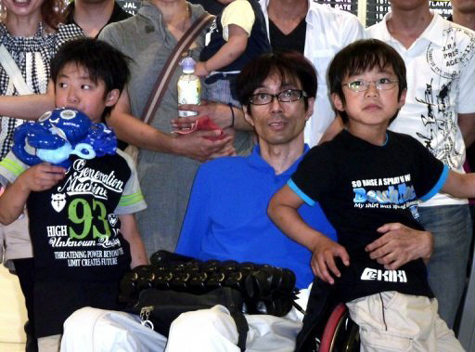 Ông Seiji Uchida (giữa), đang ngồi xe lăn đang ôm hai con trước khi ông khởi hành đi Pháp “chinh phục” hòn đảo Mont Saint Michel ở Normandy, với sự “giúp sức” của Chi trợ lực ảo HAL.