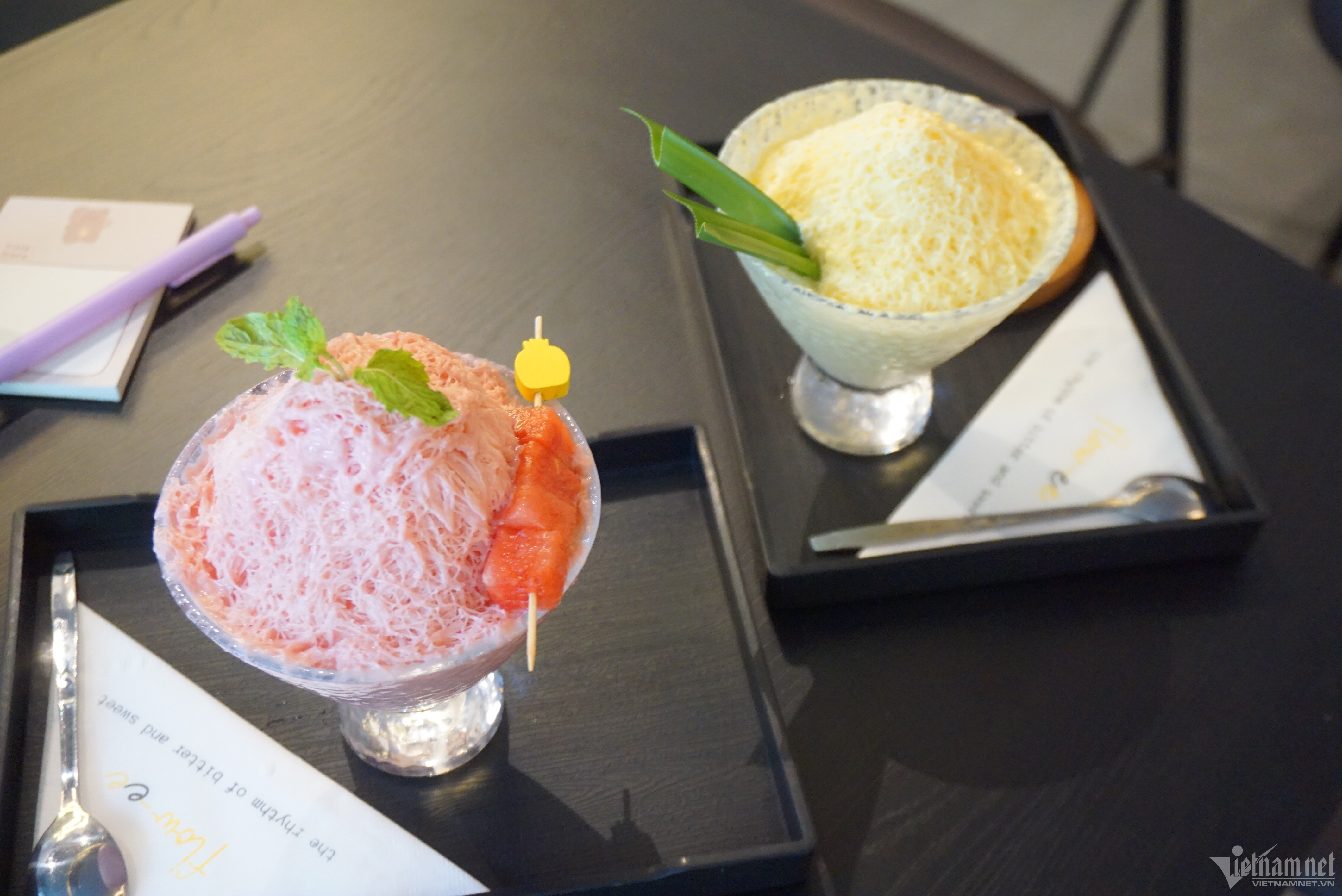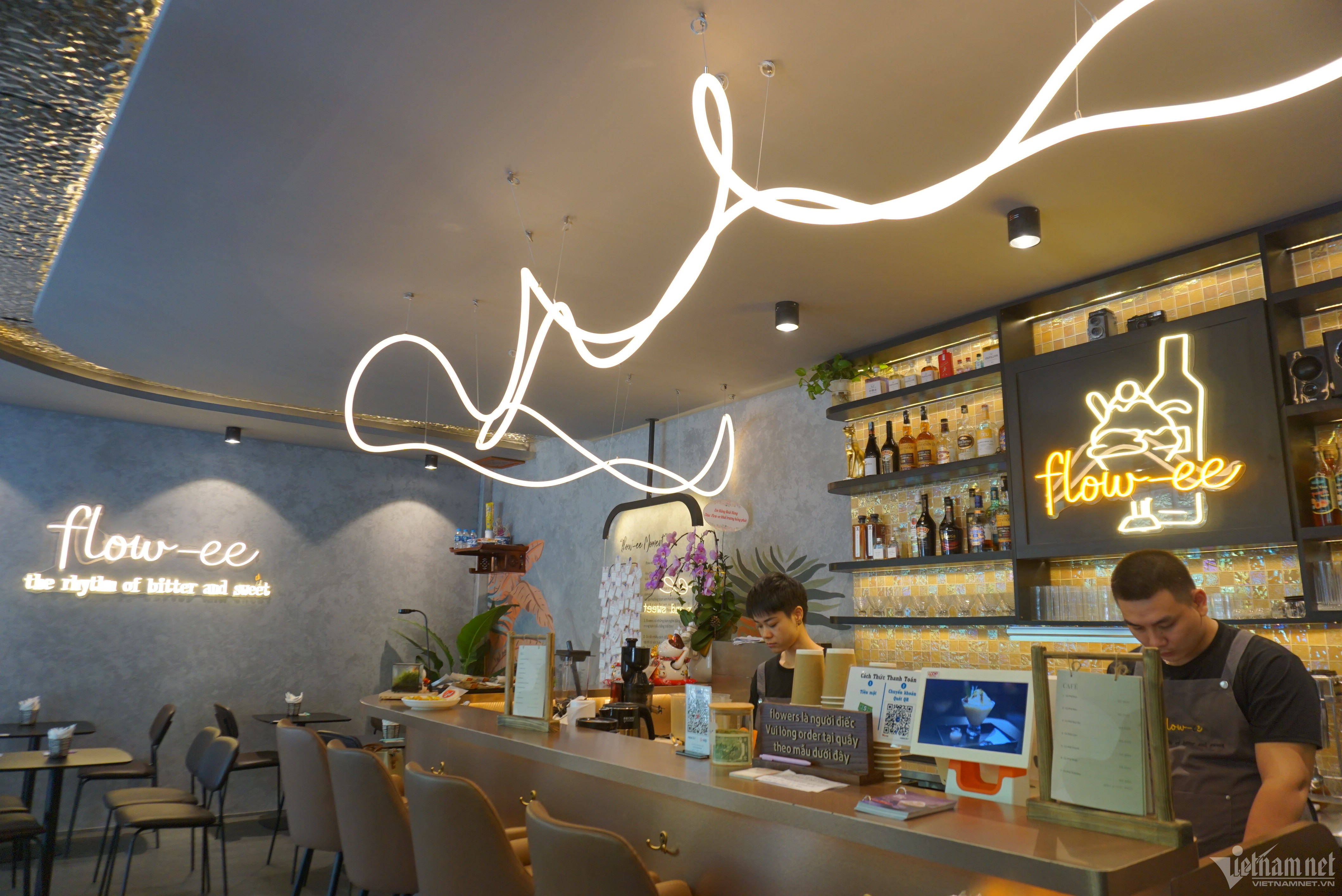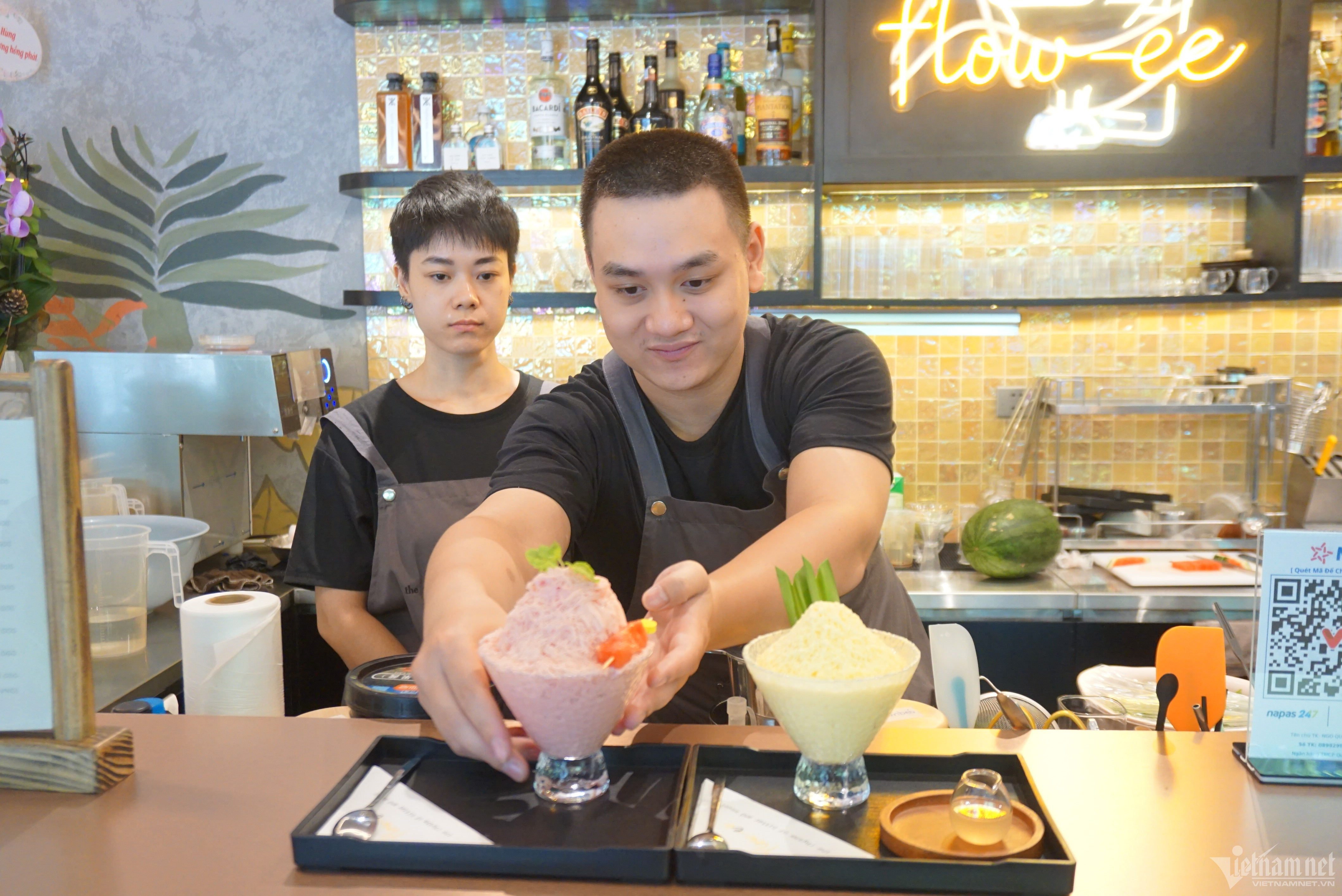 Trong ánh đèn vàng ấm áp, những nhân viên của quán cà phê Flow-ee đang chăm chú làm việc. Dưới những bàn tay khéo léo nhanh nhẹn, món bingsu rượu – món “tủ” của quán đã sẵn sàng để phục vụ khách hàng.