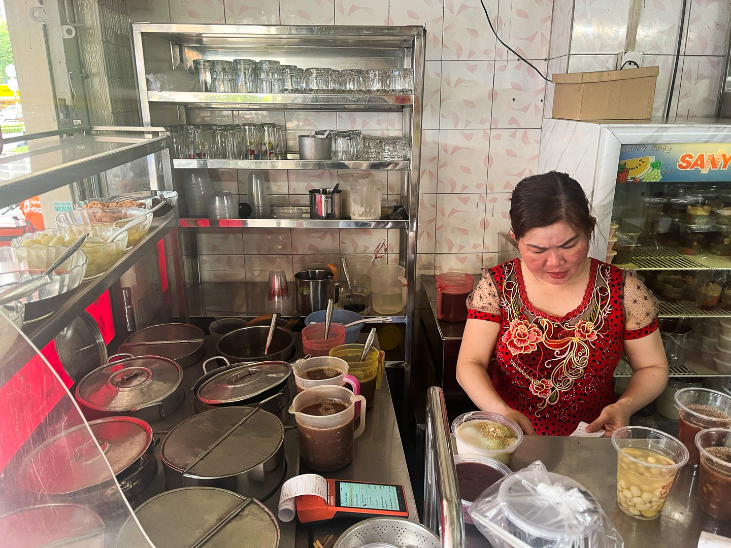 Hôm nay, quán phục vụ 3 loại chè đậu đỏ, gồm chè đậu đỏ, đậu đỏ dừa và đậu đỏ hạt sen. Số lượng đậu đỏ dừa là hút khách nhất vì vị dừa thơm béo, ngọt vừa phải, có đá nhuyễn ăn kèm, không gây cảm giác béo ngậy.