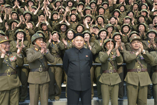| Lãnh đạo Triều Tiên Kim Jong-un được vỗ tay ca ngợi khi ông hướng dẫn một cuộc tập trận phóng rocket tháng 4/2014. (Ảnh: KCNA/Reuters) |