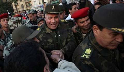 Các tướng lĩnh Ai Cập chào hỏi người dân khi họ đi qua Quảng trường Tahrir. (Ảnh: AP)