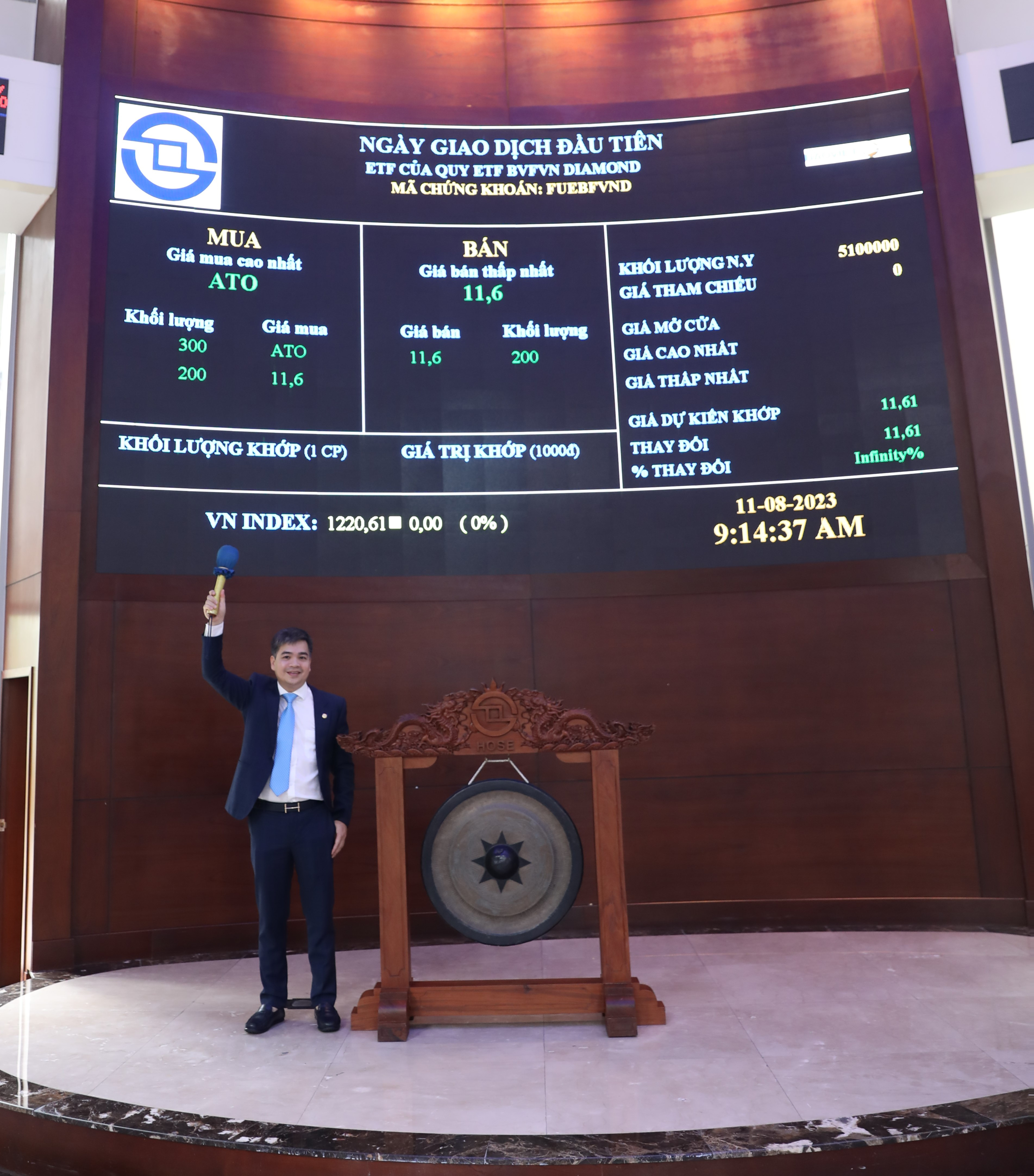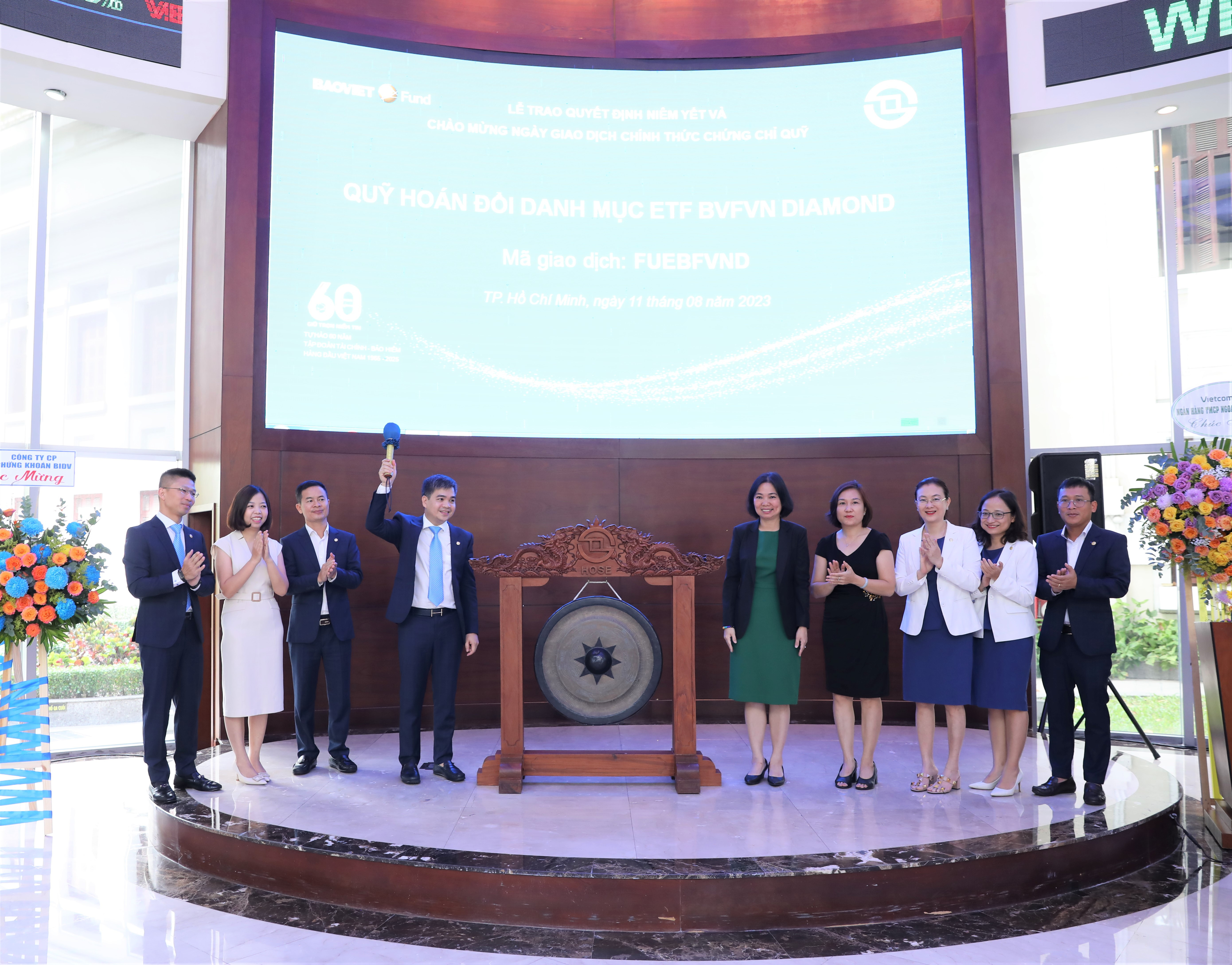 Tại buổi lễ trao quyết định niêm yết, đại diện lãnh đạo HOSE đã chúc mừng phiên giao dịch đầu tiên của chứng chỉ quỹ FUEBFVND. Kết thúc buổi lễ, đại diện Công ty Quản lý Quỹ Bảo Việt đã đánh cồng chính thức niêm yết chứng chỉ quỹ ETF BVFVN DIAMOND trên sàn HOSE.