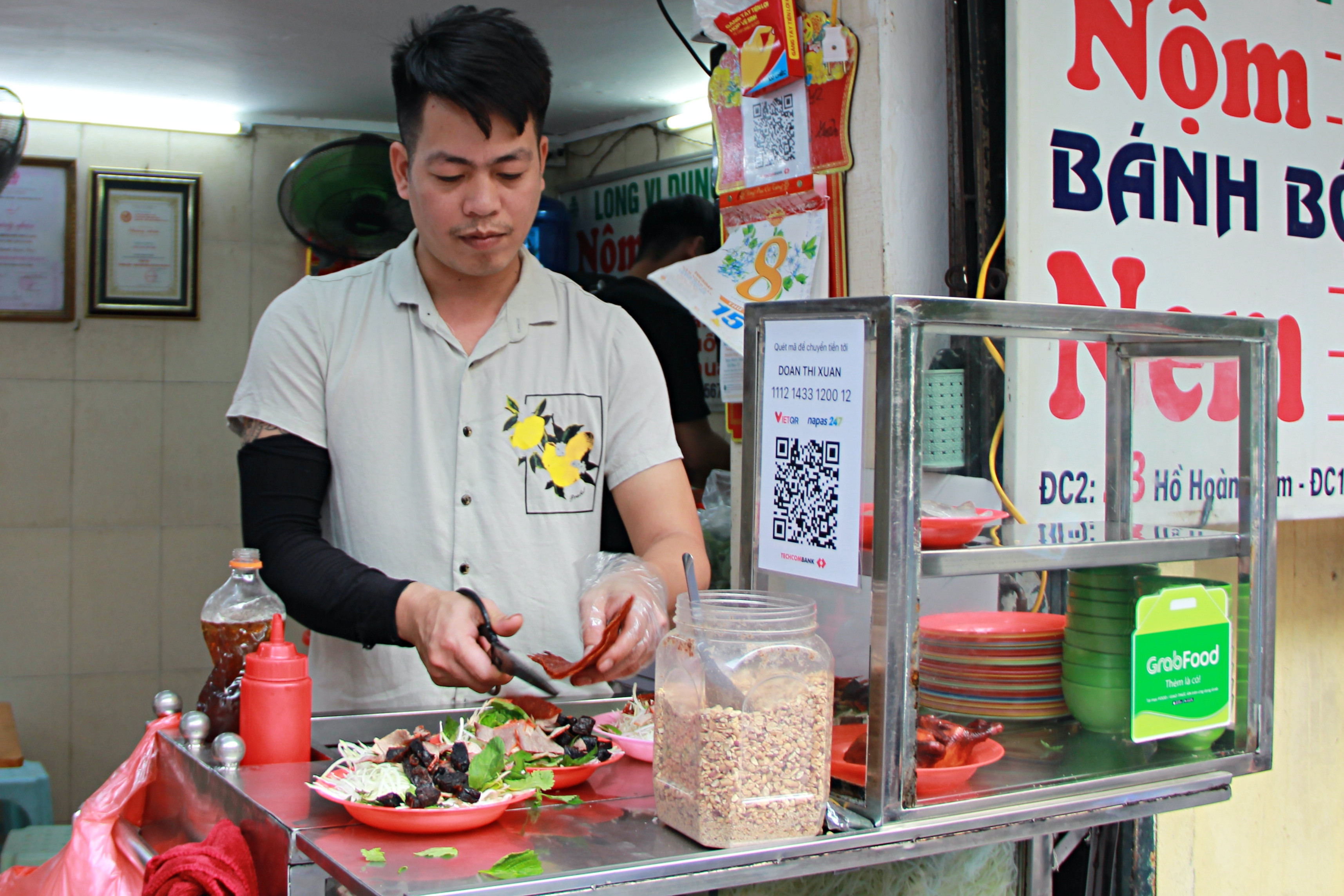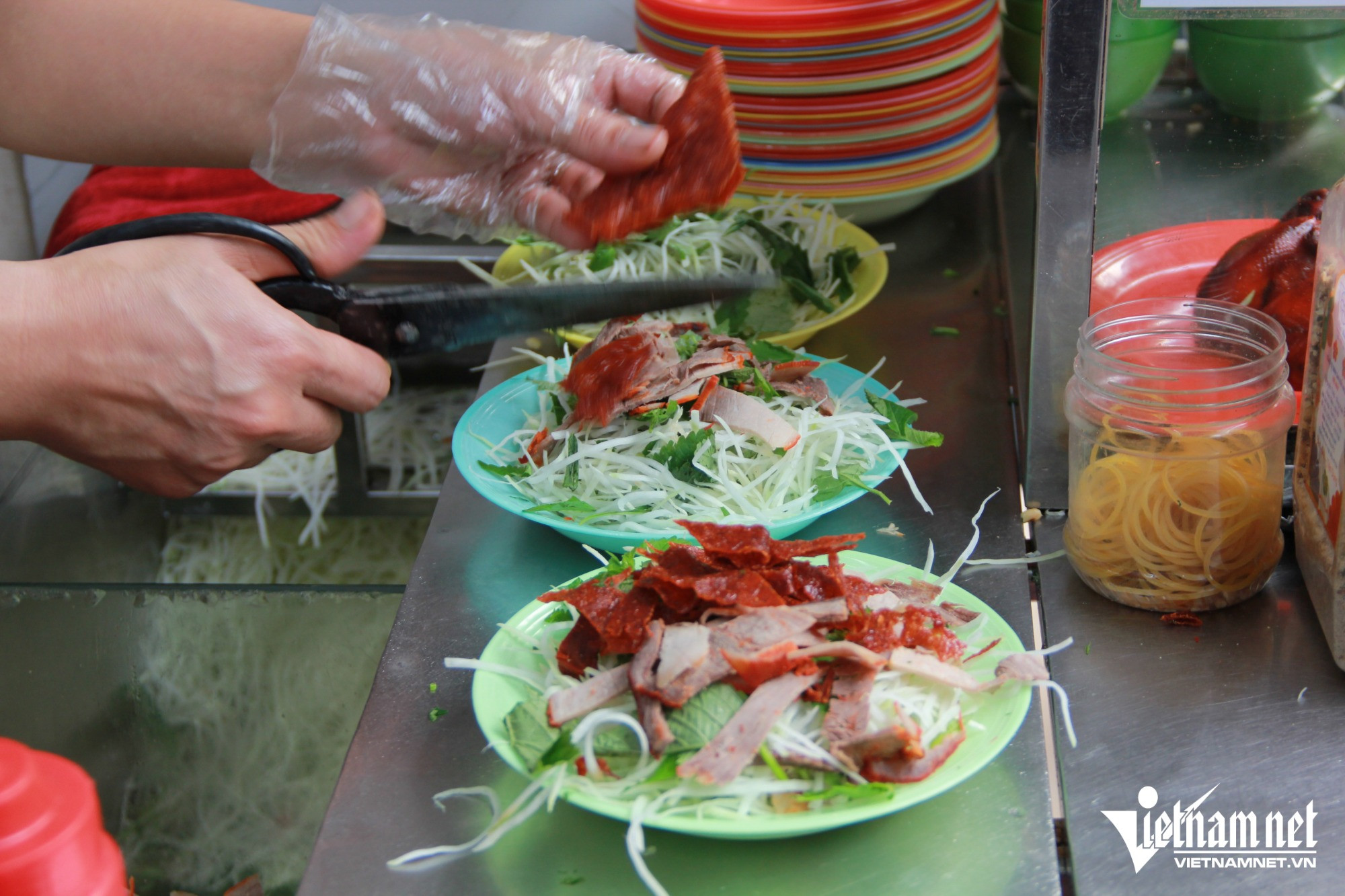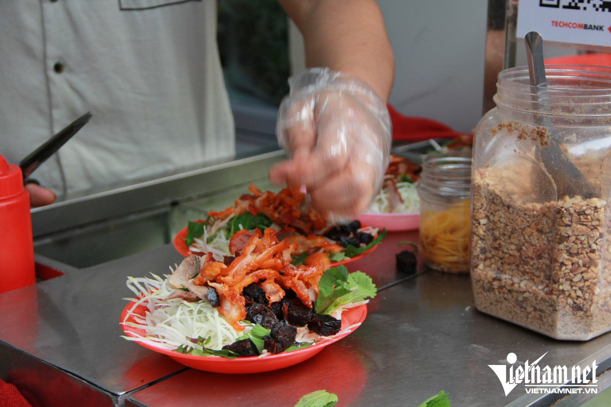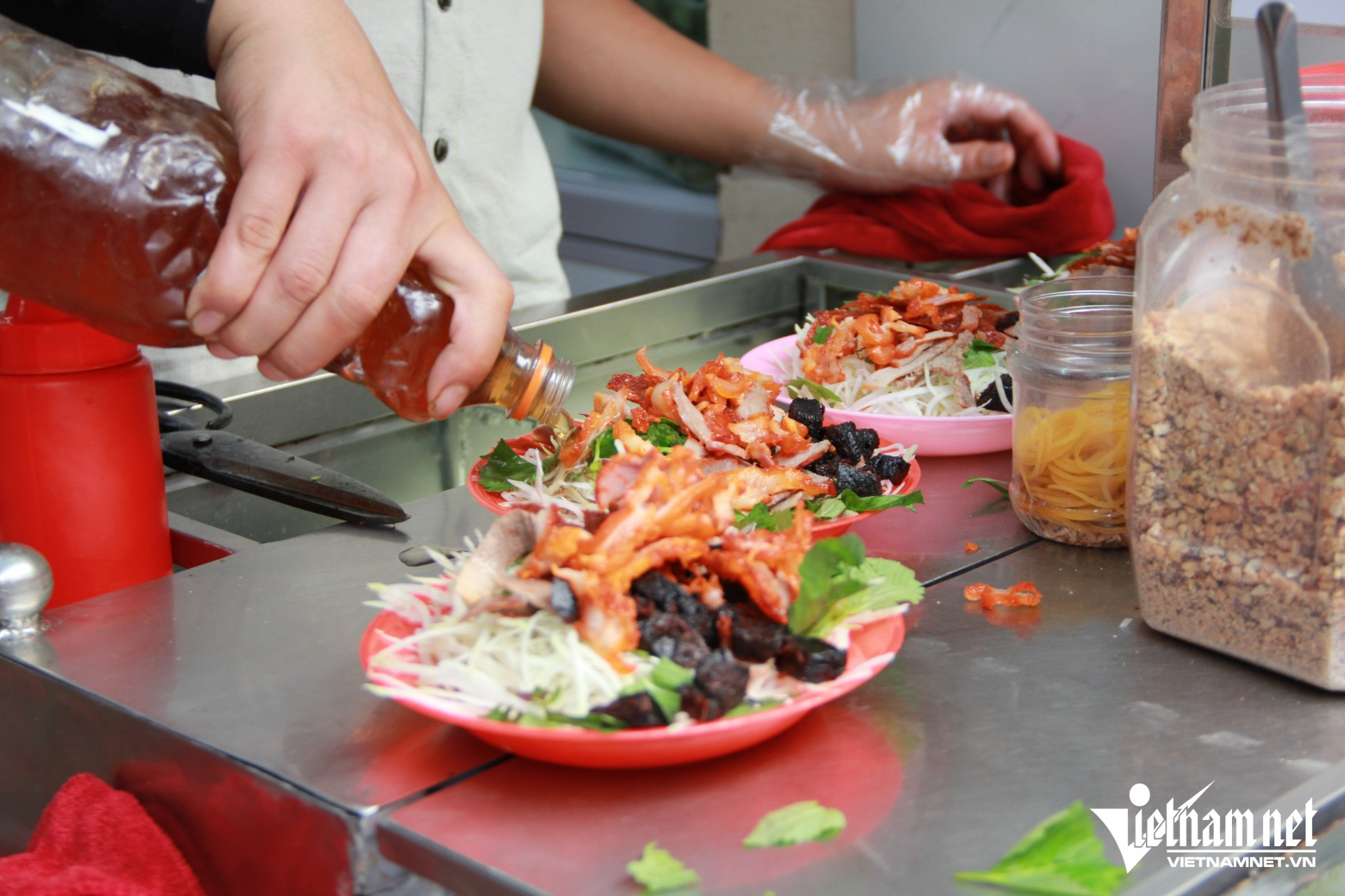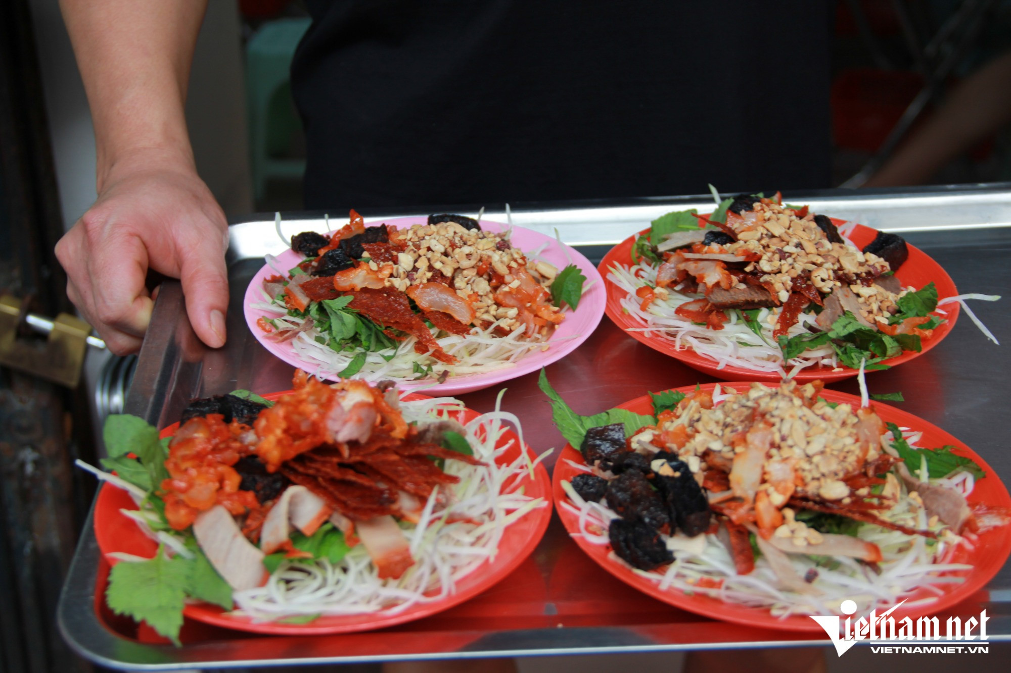 Từ đĩa nộm đầy ắp nguyên liệu, có màu sắc bắt mắt cho đến tiếng kéo cắt đều tay, kêu tách tách khiến bất cứ ai đi ngang qua cũng phải tò mò, dừng chân lại thưởng thức.