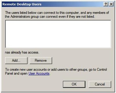 Cấu hình mặc định cho Remote Desktop là cho phép tất cả các thành viên của nhóm Administrator có kết nối từ xa. Trong Active Directory cũng có một nhóm “Remote Desktop Users”. Nhóm này cho phép người dùng có thể được thêm vào để cung cấp quyền truy cập Remote Desktop. Để cung cấp cho người dùng có quyền truy cập Remote Desktop, mở Control Panel -> System and Maintenance -> System -> Remote settings và nhấn vào nút “Select Users” gọi hộp thoại “Remote Desktop Users” như được minh họa trong hình sau đây: