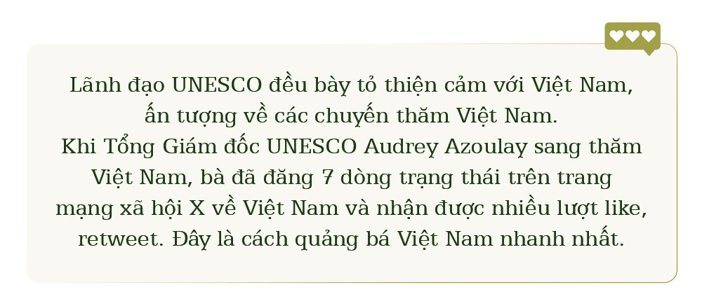 Cần tiếp tục đổi mới tư duy, phát huy giá trị các di sản, danh hiệu UNESCO là điều mà tất cả các nước đều chú trọng. Ví dụ như Ủy ban Quốc gia UNESCO của Anh xác định phải có cách tiếp cận đa chiều, đa tầng lớp, đa phương diện và đa mục tiêu để phát huy đầy đủ giá trị của các danh hiệu cả về mặt văn hóa, kinh tế, xã hội và môi trường.