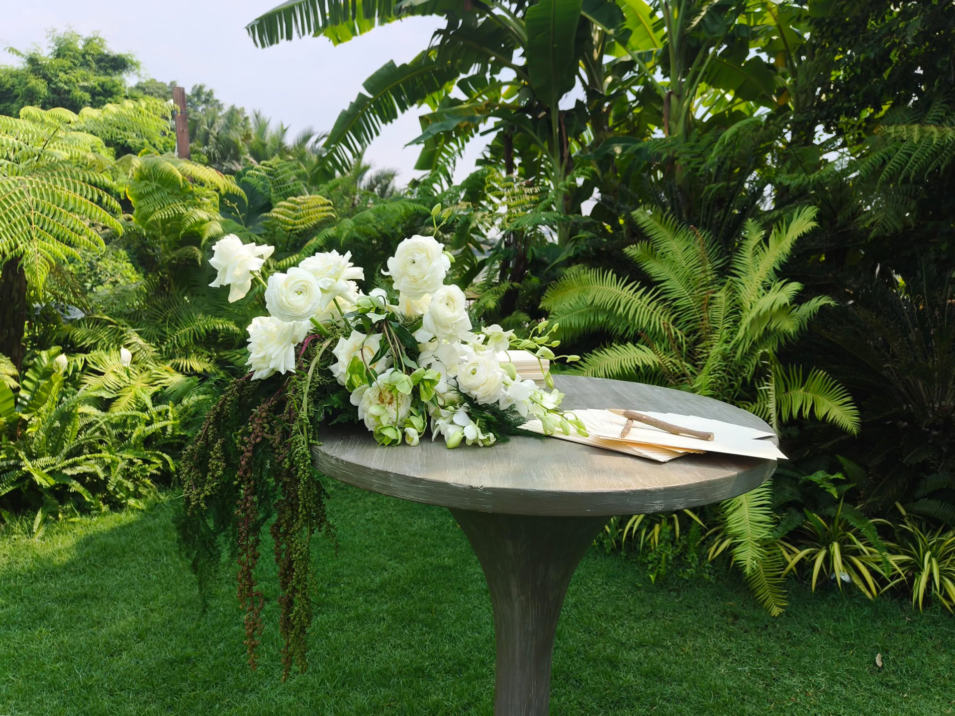 Vũ Cát Tường chọn hoa tulip trắng làm điểm nhấn cho buổi lễ vì đây là loài hoa vũ công Thu Trang yêu thích. Ngoài ra, tất cả hoa và trang trí tại sự kiện đều đơn giản, bình dị, không cầu kỳ, đắt tiền.