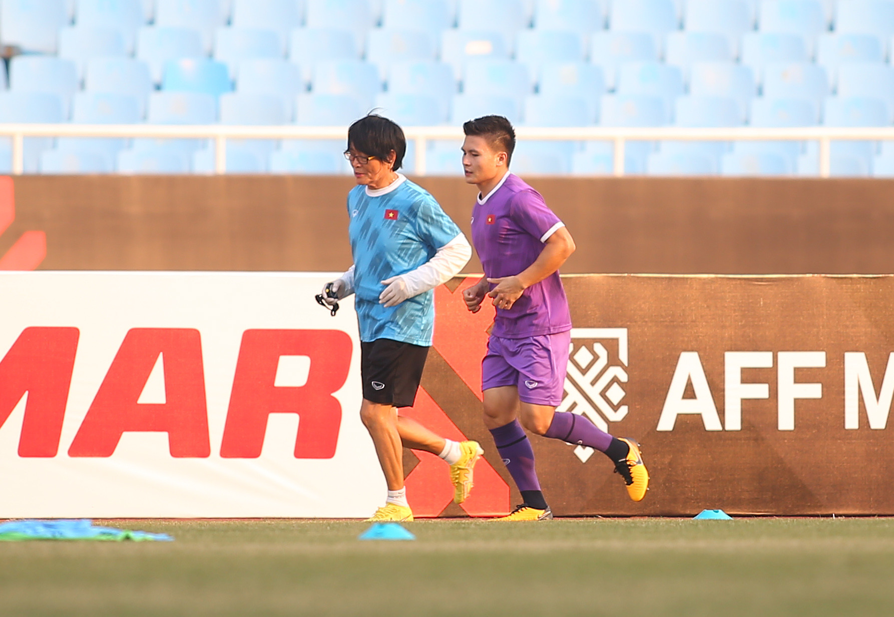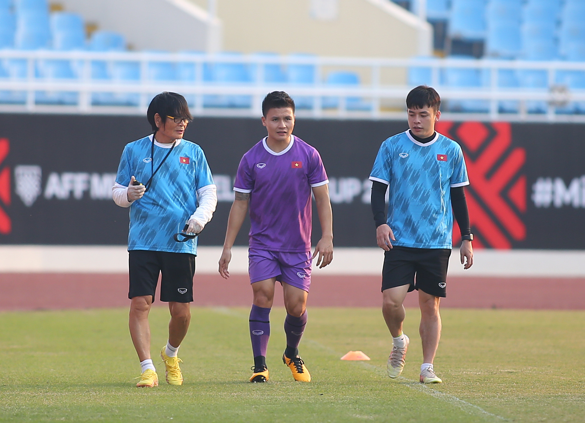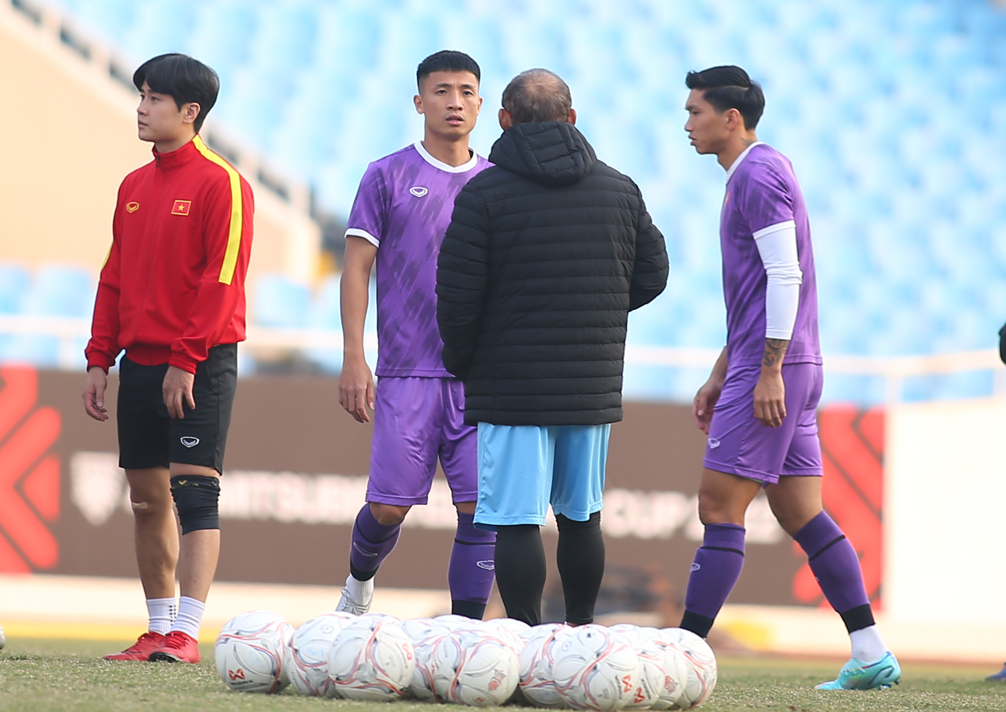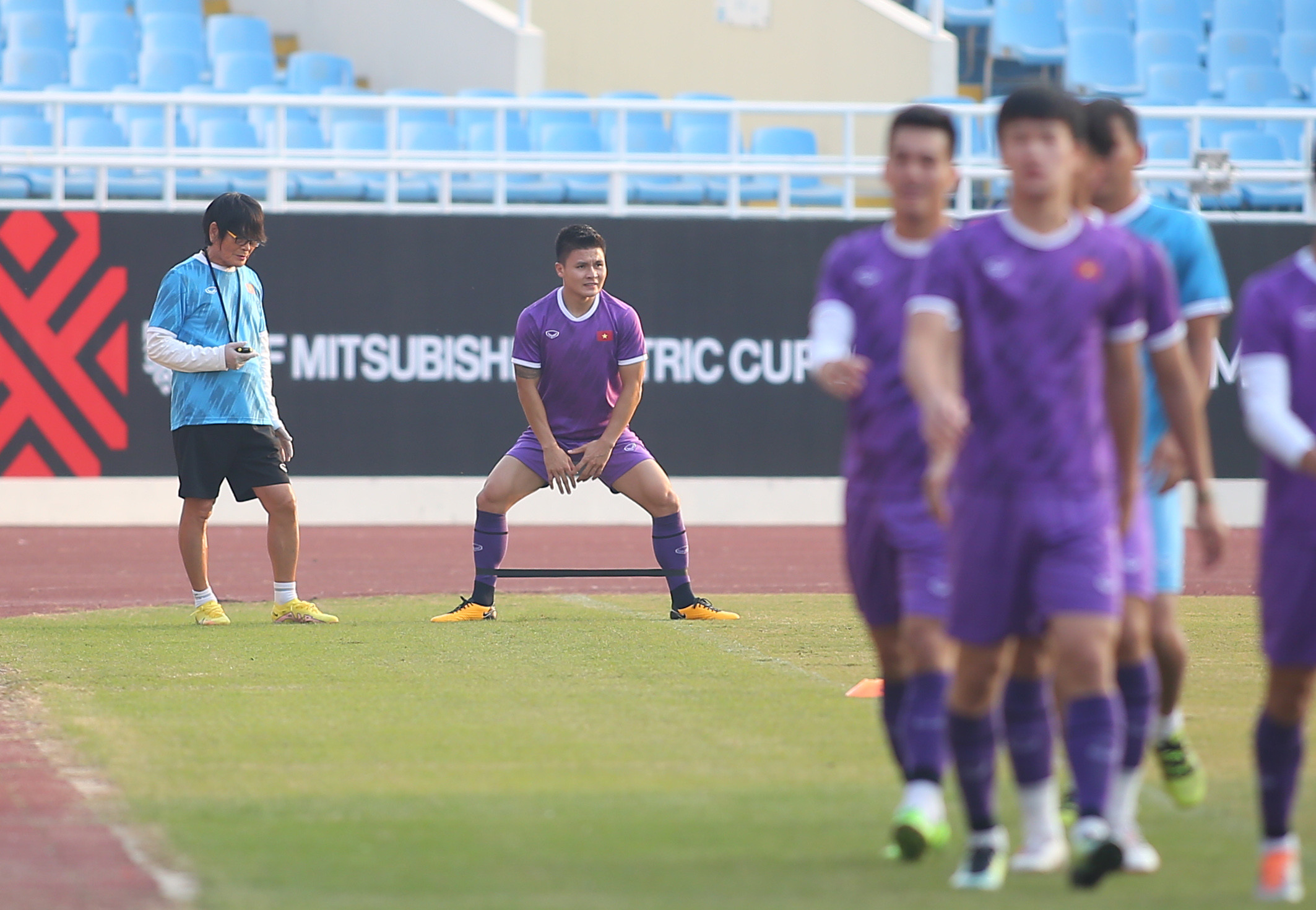 Trở về nước sau trận thắng Lào, Quang Hải không xuất hiện ở buổi tập của tuyển Việt Nam ngày 23/12 do bị căng cơ đùi. Chiều nay, số 19 trở lại tập luyện cùng các đồng đội, chuẩn bị cho trận gặp Malaysia, lượt thứ 2 bảng B, AFF Cup 2022Tuyển Việt Nam có 5 buổi tập chuẩn bị cho trận đấu mang tính then chốt tại bảng B. Văn Hậu rất tự tin khi đối đầu với Malaysia. Cầu thủ CLB Công an Hà Nội đang có phong độ rất cao, đóng góp một bàn thắng trong trận thắng Lào 6-0HLV Park Hang Seo trao đổi khá lâu với các học trò trước buổi tậpThầy Park hỏi thăm tình hình sức khỏe của Bùi Tiến Dũng. Trung vệ này mới trở lại sau khi mắc Covid-19Tâm điểm của buổi tập là sự xuất hiện của Quang Hải. Dù có mặt trên sân nhưng số 19 phải tập riêng với bác sĩDù chấn thương căng cơ đùi không nghiêm trong nhưng khả năng ra sân của Quang Hải ở trận gặp Malaysia vẫn bỏ ngỏQuang Hải nhận được sự "chăm sóc" đặc biệt. Anh là cầu thủ rất có duyên ghi bàn vào lưới của MalaysiaTrong khi đó Hồng Duy tập luyện bình thường cùng các đồng độiTuyển Việt Nam có sự khởi đầu thuận lợi nhưng phía trước là một thử thách lớn mang tên MalaysiaHLV Park Hang Seo tính toán kỹ về nhân sự, lối chơi trước trận đấu quan trọng nhất ở vòng bảng.