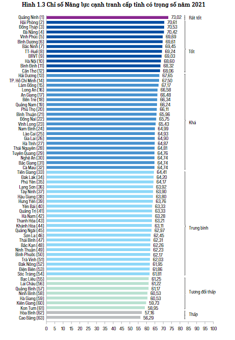 Dẫn đầu Bẳng xếp hạng PCI 2021 là Quảng Ninh với 73,02 điểm, giảm gần 3 điểm so với năm 2020. Đây là lần thứ 5 liên tiếp, tỉnh này dẫn đầu toàn quốc về điểm số PCI. Quảng Ninh là tỉnh duy nhất được xếp hạng chất lượng điều hành kinh tế "rất tốt".