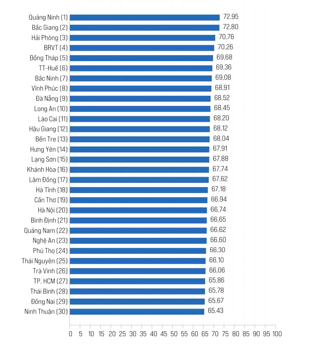 Xếp sau Bắc Giang là các địa phương TP. Hải Phòng với 70,76 điểm, tỉnh Bà Rịa - Vũng Tàu xếp thứ 4 với 70,26 điểm, đứng vị trí thứ 5 là tỉnh Đồng Tháp với 69,68 điểm.