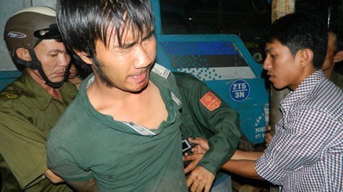| Tên cướp Huỳnh Trung Du bị bắt trói. |