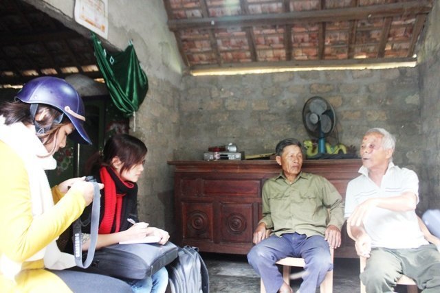 | Ông Trần Bá Nam (bên phải, 62 tuổi, xóm Trung Đông, xã Vân Diên phải) với vết thương tích đầy người may mắn thoát chết đang kể lại vụ tai nạn thảm khốc. |