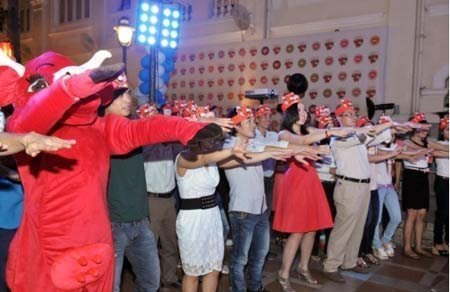 | Lãnh đạo và nhân viên Công ty Bel Việt Nam cùng nhau nhảy vũ điệu “Con Bò Cười” để chia sẻ niềm vui thành công và hướng tới những mục tiêu, kế hoạch của năm 2013. |