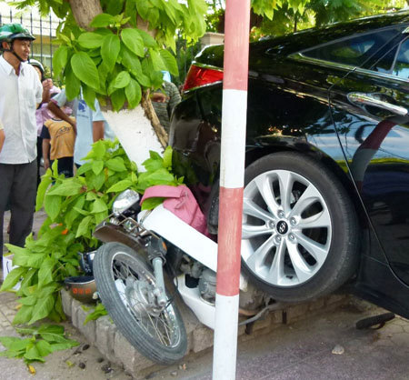 Đang ngồi xe máy đậu dưới gốc cây trên vỉa hè chị Nguyễn Thị Hồng Nhung, 25 tuổi, trú Nha Trang, Khánh Hòa, bất ngờ bị chiếc xe ô tô màu đen, BKS 79A - 002.47 lùi vọt từ dưới lòng đường, với tốc độ khoảng 40-50km/giờ, húc văng vào trong. Rất may, gốc cây lớn trên vỉa hè đã chặn đứng đà lao của chiếc xe ô tô.
