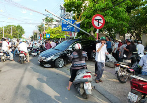 Vụ tai nạn hi hữu xảy ra khoảng 16 giờ chiều 23.5, trước cổng Kho bạc nhà nước TP Nha Trang trên đường Lê Thánh Tôn.