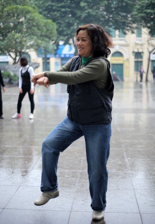| Bà Nguyễn Thị Hòa năm nay gần 60 tuổi, nhà ở phường Chương Dương, Hoàn Kiếm dù không tham gia nhóm này nhưng sáng nào cũng ra tập "ké" do thấy điệu nhảy rất vui nhộn, không bị nhàm chán như cách tập thể dục thông thường. |