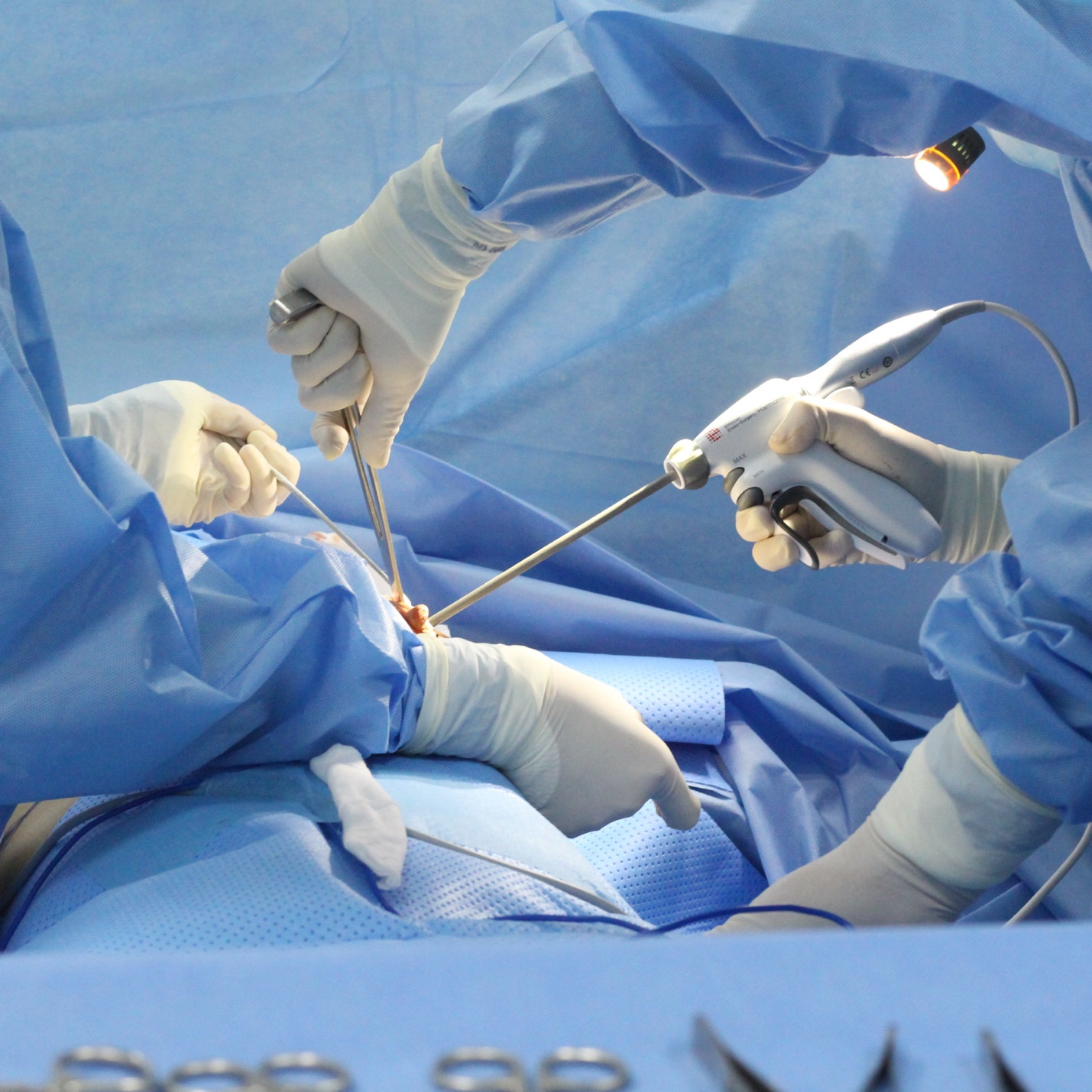 Ths.BS Hồ Cao Vũ cho biết loại dao sử dụng trong phẫu thuật nâng ngực là dao thường, dao siêu âm Harmonic hoặc InnoLcon, dao lưỡng cực Ligasure và Enseal.