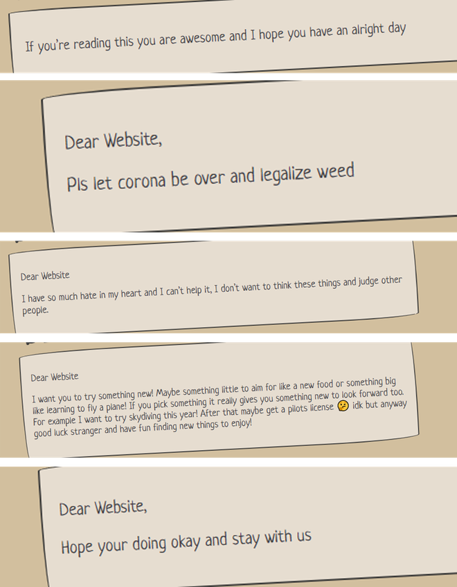 Có lẽ một trong những động lực để trang web có thể tồn tại trong điều kiện hiện nay là vì nhiều người đang phải ở nhà do đại dịch Covid-19. Nó khiến nhiều người mong muốn chia sẻ hơn về tâm trạng của mình vào một nơi nào đó rồi có thể quên nó đi mà không phải lo lắng gì cả. Có lẽ khi đại dịch này qua đi, sự tồn tại của trang web này cũng không còn cần thiết nữa.