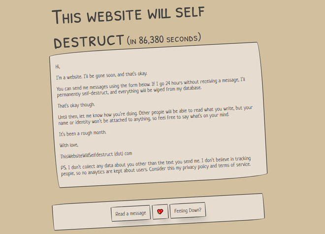 Và chúng không chỉ là các tin nhắn thông thường. Bạn có thể thấy những tuyên bố về tình yêu đơn phương không được hồi đáp lại, những trò đùa về các trò chơi điện tử, hoặc lời cảm ơn chân thành về sự tồn tại của một website độc đáo như thế này. Thậm chí nếu bạn cảm thấy một tin nhắn buồn bã từ ai đó đang ở trong thời kỳ khó khăn, bạn có thể ấn vào nút "Feeling Down?", trang web thiswebsitewillselfdestruct.com sẽ hiển thị thông tin liên lạc về các tổ chức có thể giúp đỡ.